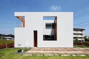 シンプルな外観に多様なサイズの窓がアクセントで加わっています。大きな窓から伸びるウッドデッキは、外との繋がりを生み出す仕様です。